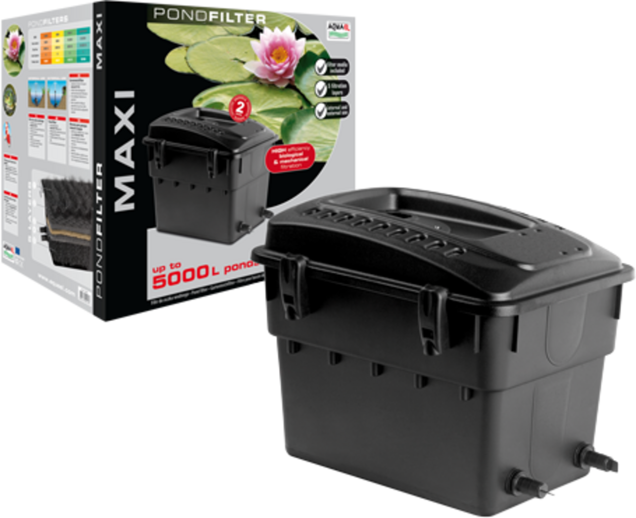 Das mit dem MAXI-Filter gelieferte Filtersystem garantiert eine umfassende mechanische und biologische Filterung. Der MAXI-Filter kann zusätzlich mit einer UV-Lampe ausgestattet werden, um das Aufblühen von Wasser und das Algenwachstum zu verhindern. Das Standard-MAXI-Paket enthält keine UV-Lampe.