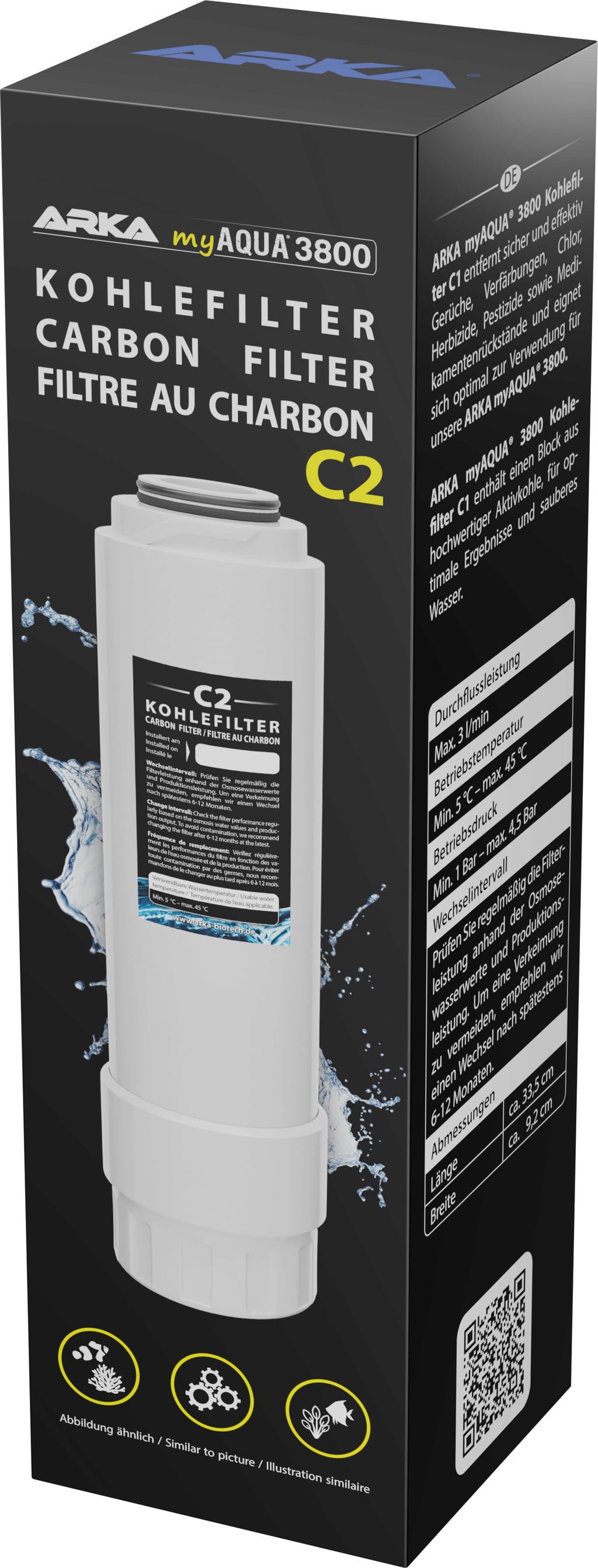 ARKA myAQUA® 3800 KOHLEFILTER C2 ist einer von vier Austauschfiltern für die myAqua 3800® Umkehrosmoseanlage von ARKA. Der Block aus hochwertiger Aktivkohle auf Kokosbasis sorgt für sauberes Wasser.