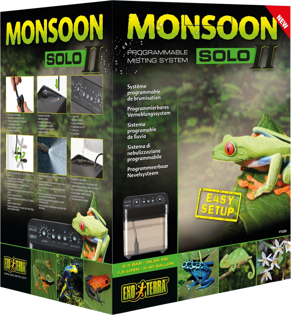 Die programmierbare Beregnungsanlage Monsoon Solo II von Exo Terra ist ein einzigartiges System zur Befeuchtung und Beregnung von kleineren Terrarien und Gewächshäusern! Das kompakte Gerät ist nach deinen Wünschen und nach den Bedürfnissen deiner Terrarientiere einstellbar! Dabei kannst du zu bestimmten Zeiten entweder Niederschlag oder einen feinen Sprühnebel erzeugen.