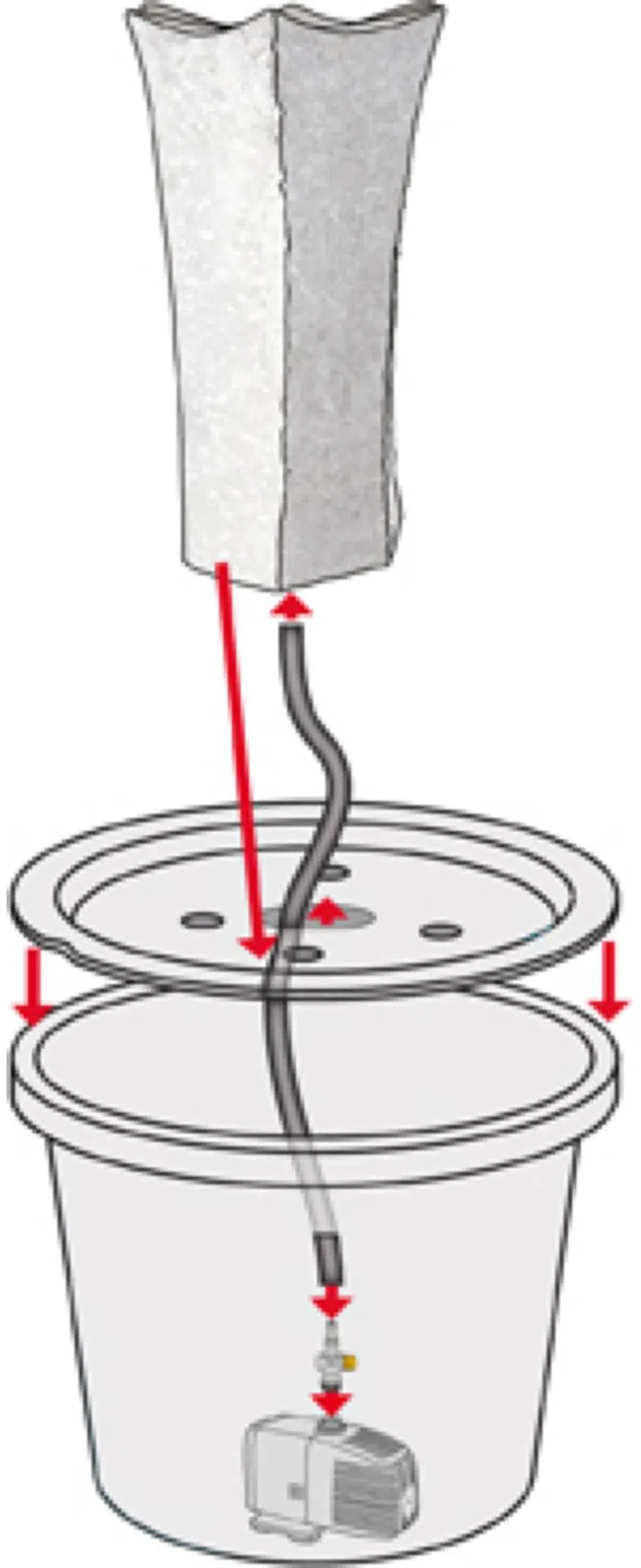 - Schläuche in die vorbereiteten Öffnungen des Brunnenaufsatzes führen