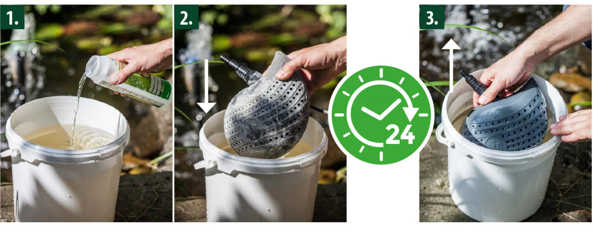 Die Reinigungslösung darf auf keinen Fall in Teich und Biotop gelangen! Bitte immer über das häusliche Abwassersystem entsorgen.