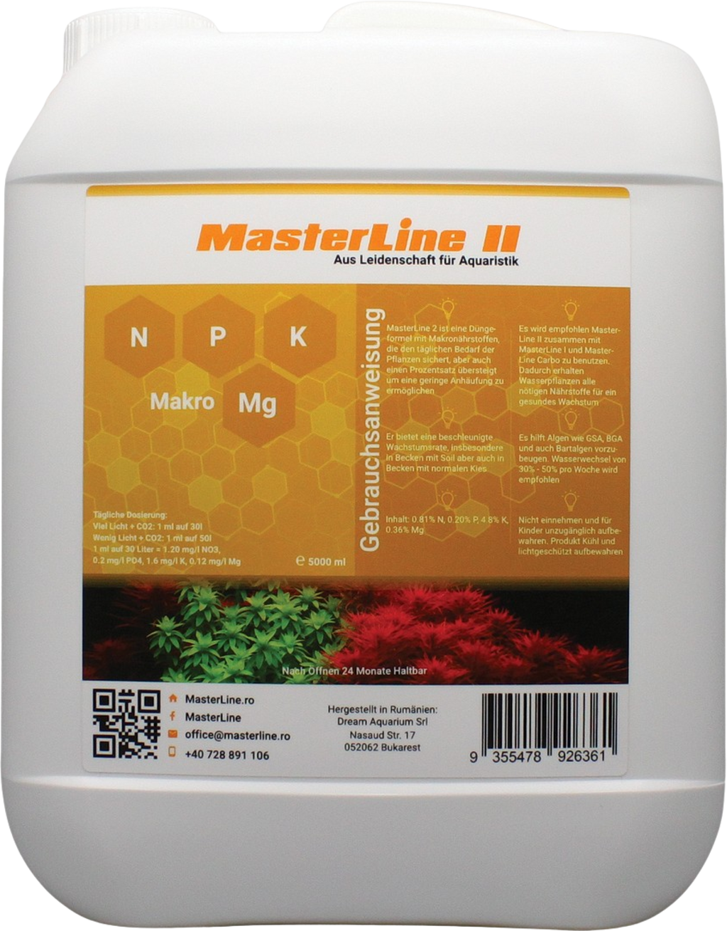 MasterLine II ist ein konzentrierter Makronährstoff-Kombidünger für Becken mit Soil und Kies. Er enthält Stickstoff, Phosphor, Kalium und Magnesium. Das Pflanzenwachstum wird stimuliert und beugt Eisenmangel vor - die Pflanzenfarben entwickeln bzw. erhalten ihre intensive Leuchtkraft. Um eine gesunde Umwelt für alle Beckenbewohner zu gewährleisten, sollte ein Wasserwechsel von 30 bis 50 Prozent pro Woche durchgeführt werden!