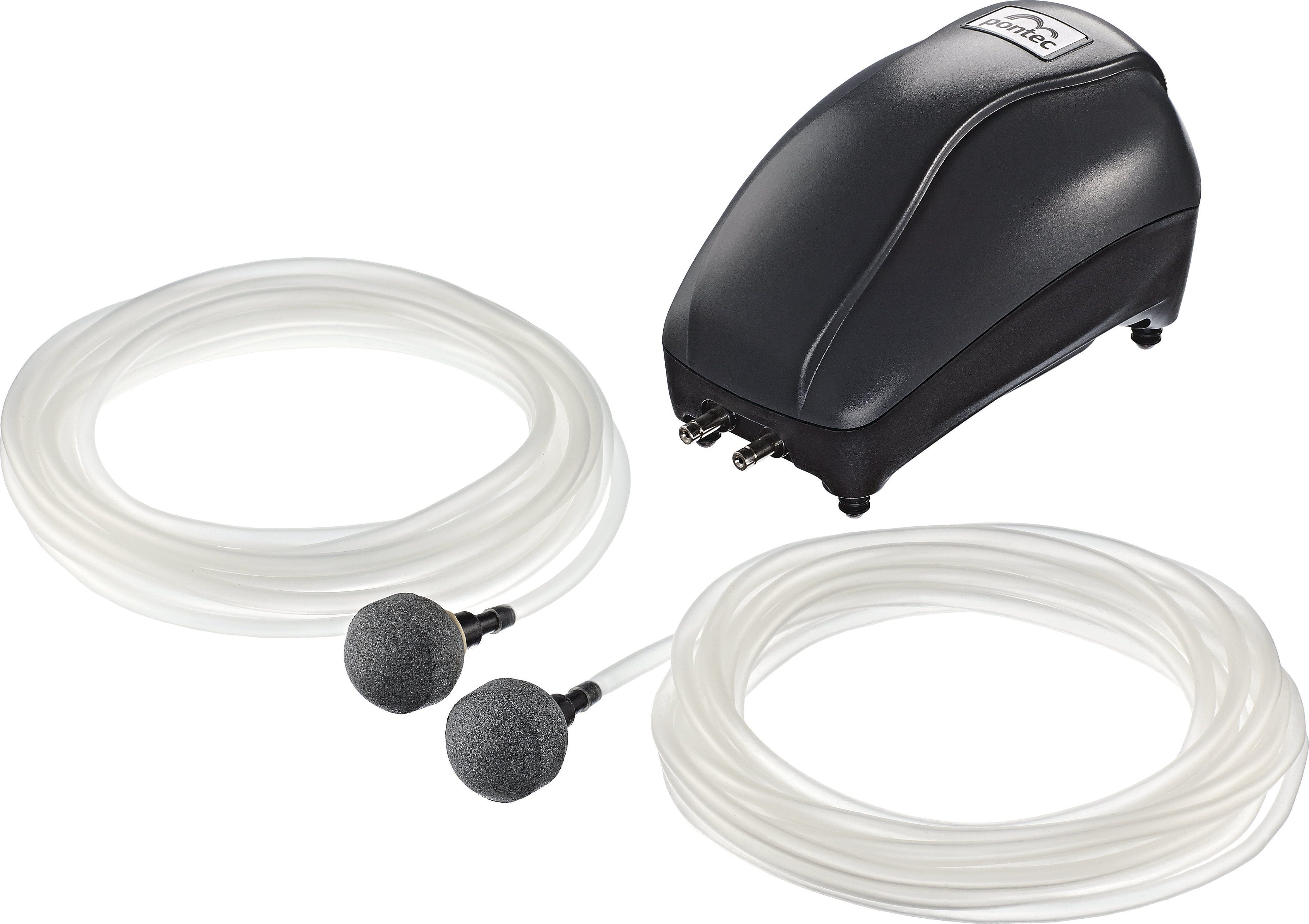 - Set 1800 & 3600: Luftpumpe, inkl. 1 Luftverteiler, 4 × 5 m Luftschlauch, 4 Ausströmersteine und Ersatzmembranen
