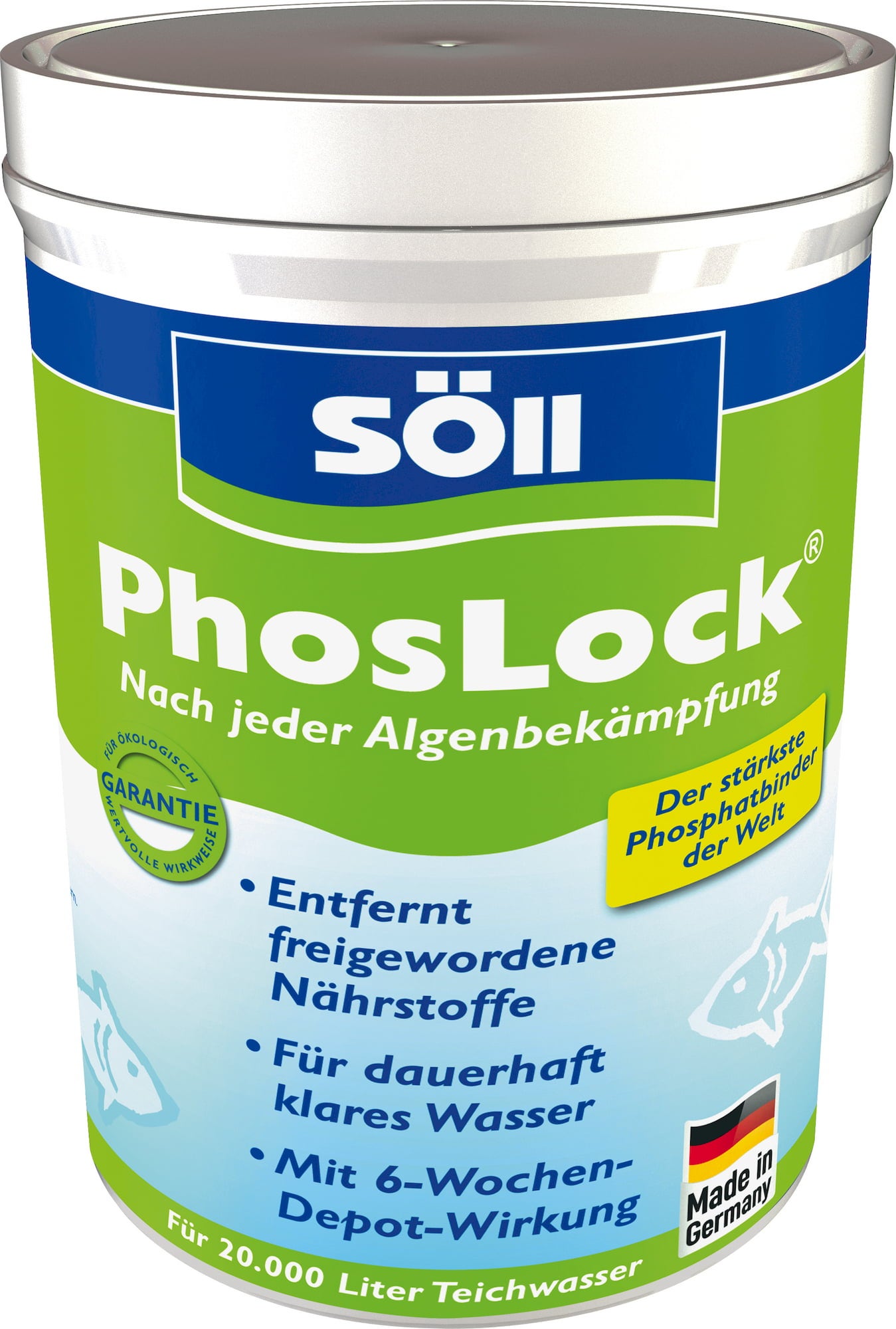 Der PhosLock soll Söll zufolge der stärkste Phosphatbinder der Welt sein. Seine mineralische Rezeptur enthält keine Schwermetalle und ist bei einer richtigen Anwendung und Dosierung für Fische, Pflanzen und andere Teichbewohner unbedenklich. PhosLock verhindert, dass sich die Nährstoffe aus dem Teichschlamm rückbilden, indem er das Phosphat in einem Mineral bindet, welches im Wasser nicht löslich ist.