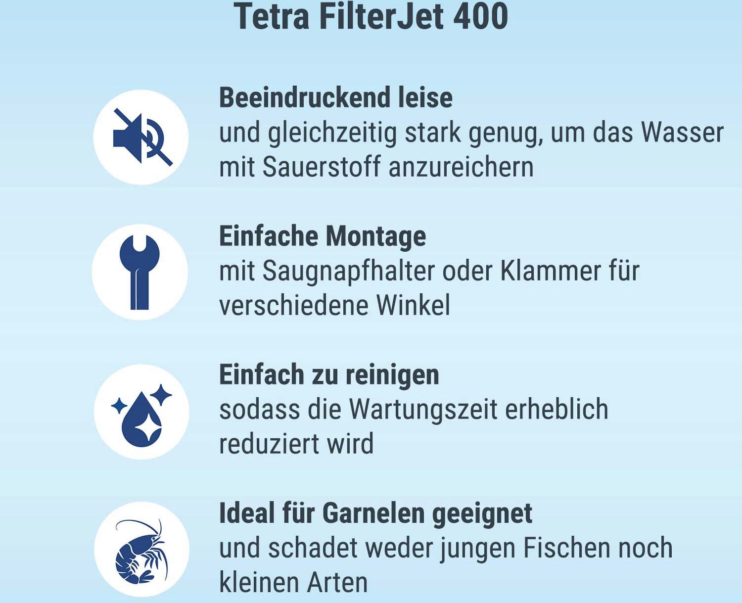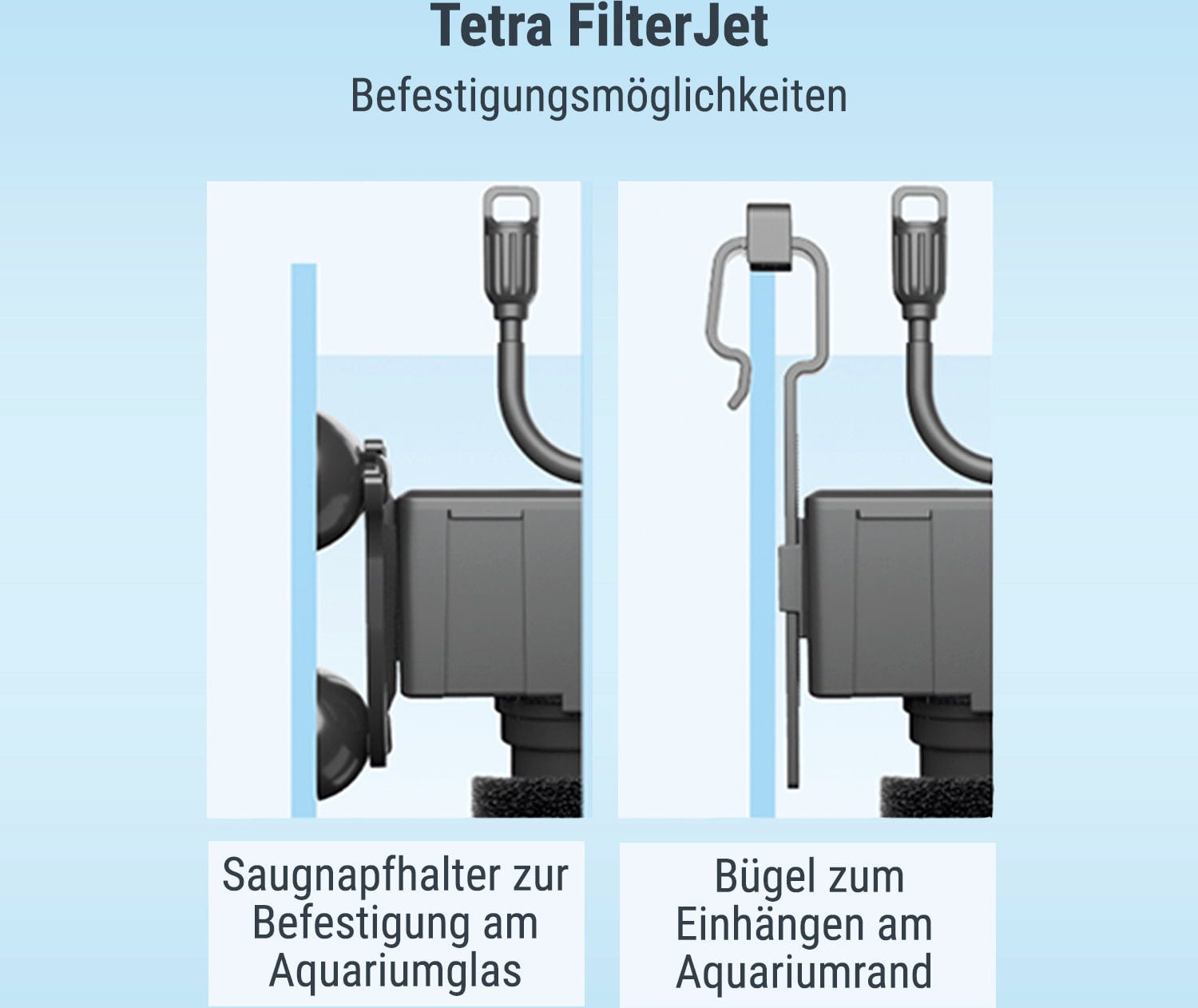 Auf diese Weise werden sowohl grobe als auch feine Schmutzpartikel aus dem Aquarienwasser entfernt. Zudem wird das biologische Gleichgewicht, das für ein intaktes Aquarium erforderlich ist, ermöglicht. Außerdem überzeugt der Innenfilter durch einen leisen Betrieb. Dank der leichten Installation ist der Tetra FilterJet innerhalb von wenigen Sekunden betriebsbereit. Im Lieferumfang sind zwei Befestigungsmöglichkeiten enthalten. Die Befestigung kann entweder über den Saugnapfhalter am Aquariumglas oder mit einem Bügel zum Einhängen am Aquariumrand erfolgen.