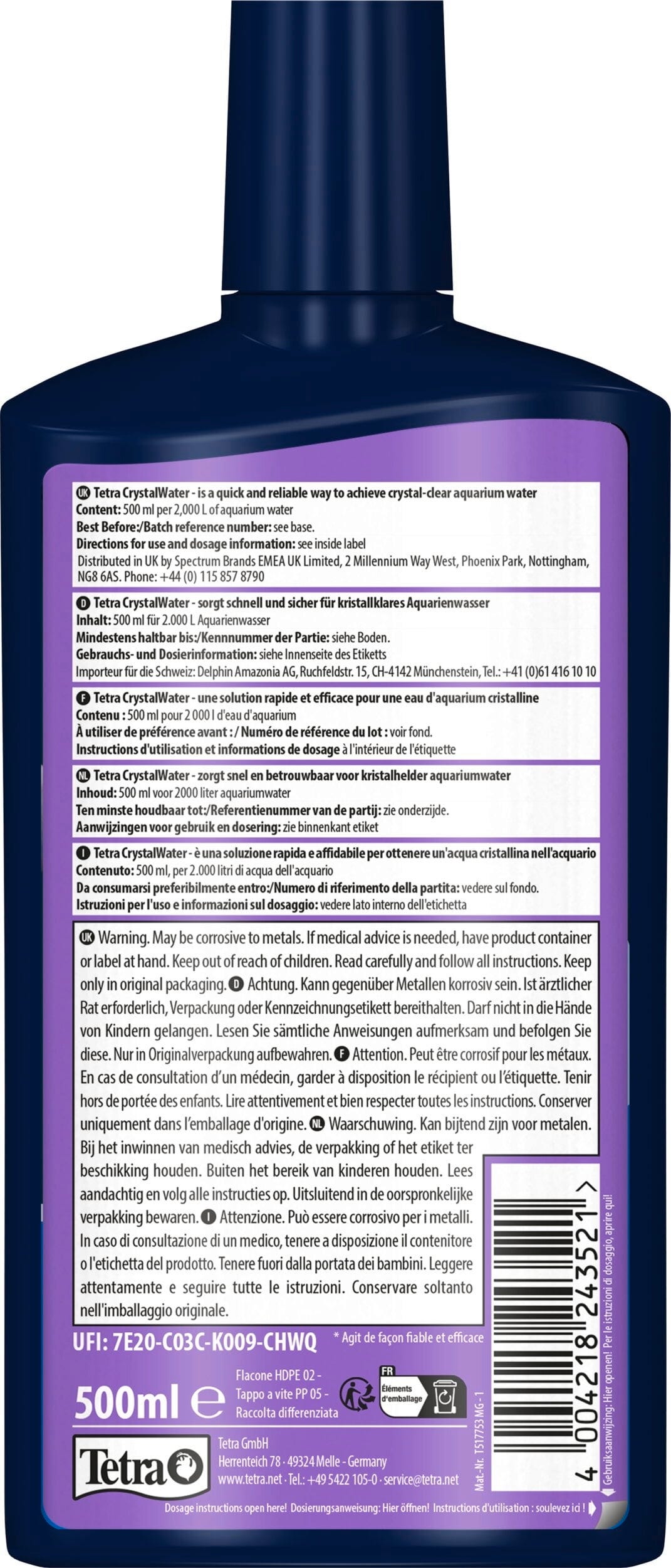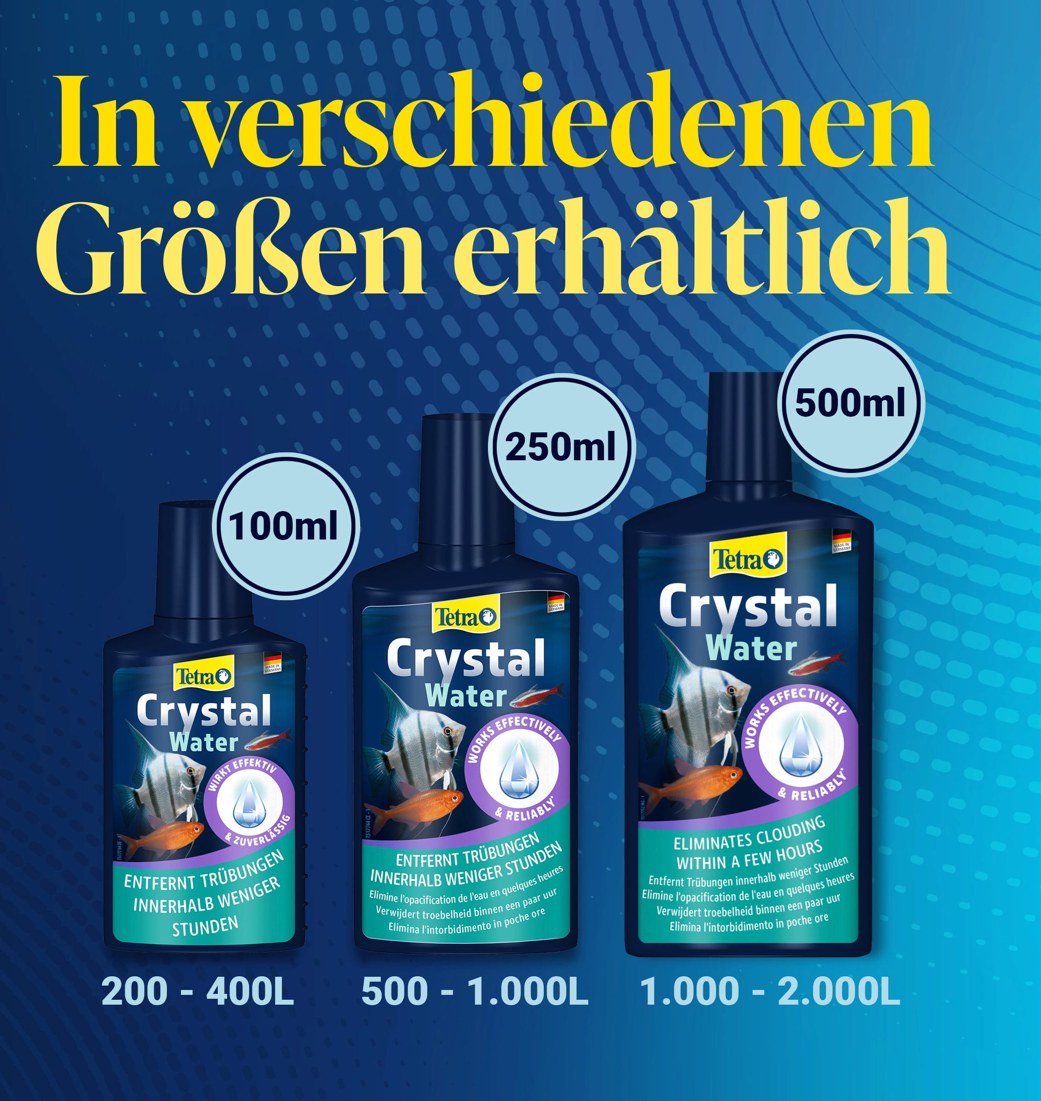 - Falls du zusätzlich einen Wasseraufbereiter wie Tetra AquaSafe nutzt, warte nach der Zugabe von CrystalWater bitte 24 Stunden, bevor du diesen anwendest.
