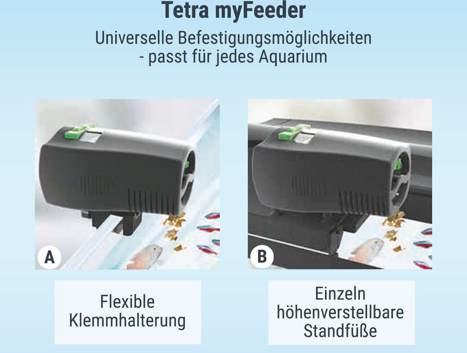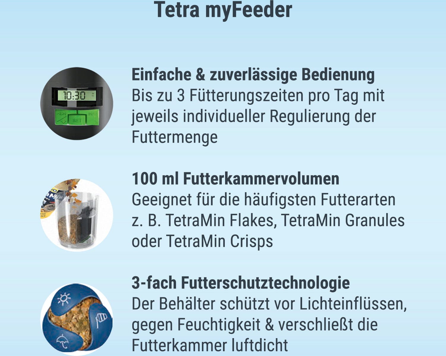 Mit dem Tetra myFeeder werden Ihre Zierfische in Ihrer Abwesenheit optimal versorgt. Der einfach zu bedienende und zuverlässige Futterautomat dient einer individuellen und gezielten Fischfütterung. Das Futter wird durch ein einzigartiges Doppelgehäuse-System sicher vor Licht, Luft und Feuchtigkeit geschützt. Die Programmierung erfolgt einfach und unkompliziert über das Digital-Display. Die individuelle Futtermenge kann reguliert werden: entweder bis zu drei Fütterungen am Tag mit individueller Futtermenge oder einmalig durch Knopfdruck. Das Futterkammervolumen entspricht 100 ml, wird luftdicht verschlossen und ist geeignet für die häufigsten Futterarten wie Granulat, Flocken oder Crisps. Der Tetra myFeeder verfügt über multifunktionale Befestigungsmöglichkeiten am Aquarienrand und einzeln höhenverstellbare Standfüße. Das Sichtfenster ermöglicht eine Füllstandskontrolle sowie eine Ladestandsanzeige der Batterien. Im Lieferumfang sind 2 VARTA Batterien enthalten, die über eine hohe Lebensdauer verfügen.