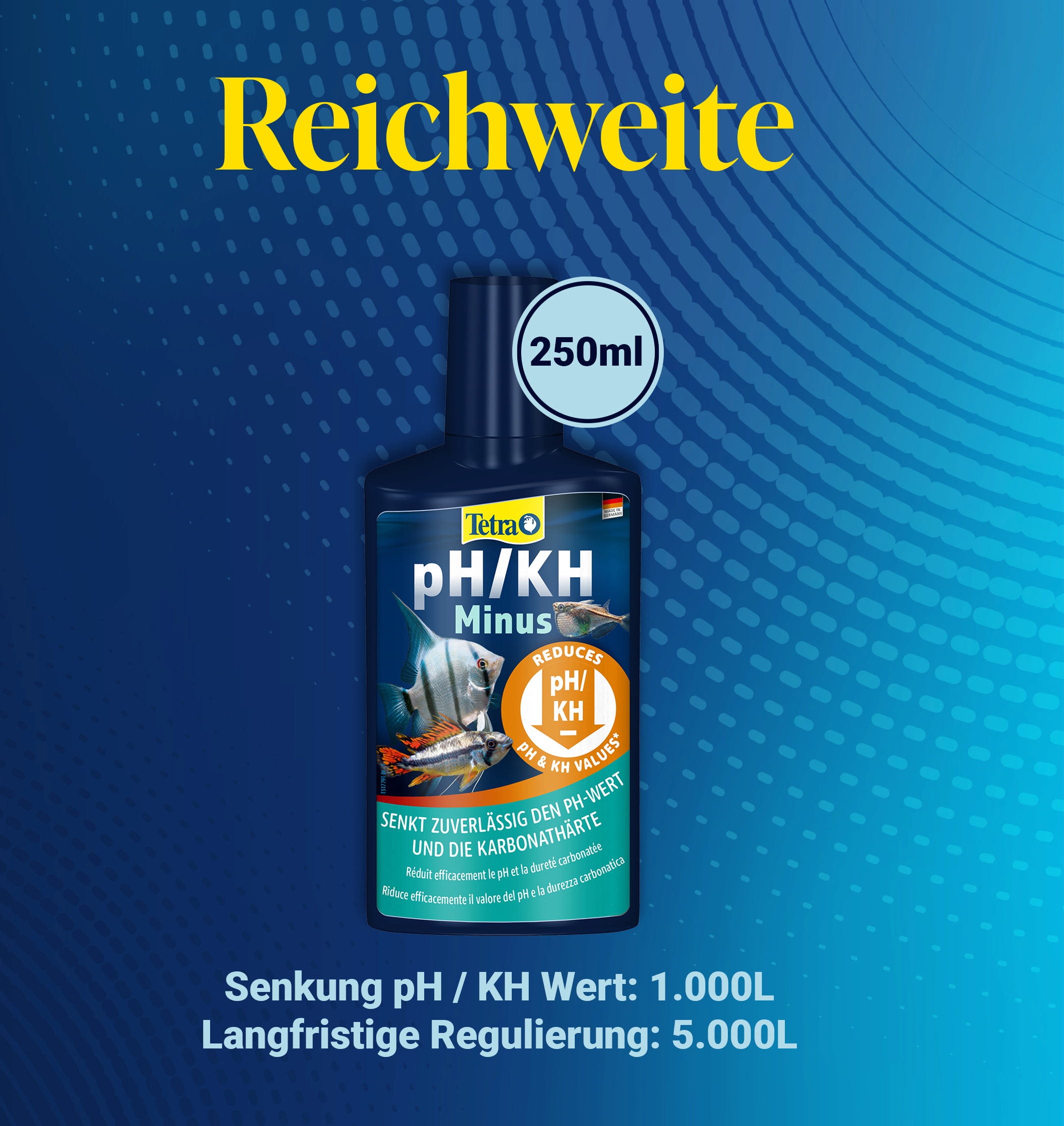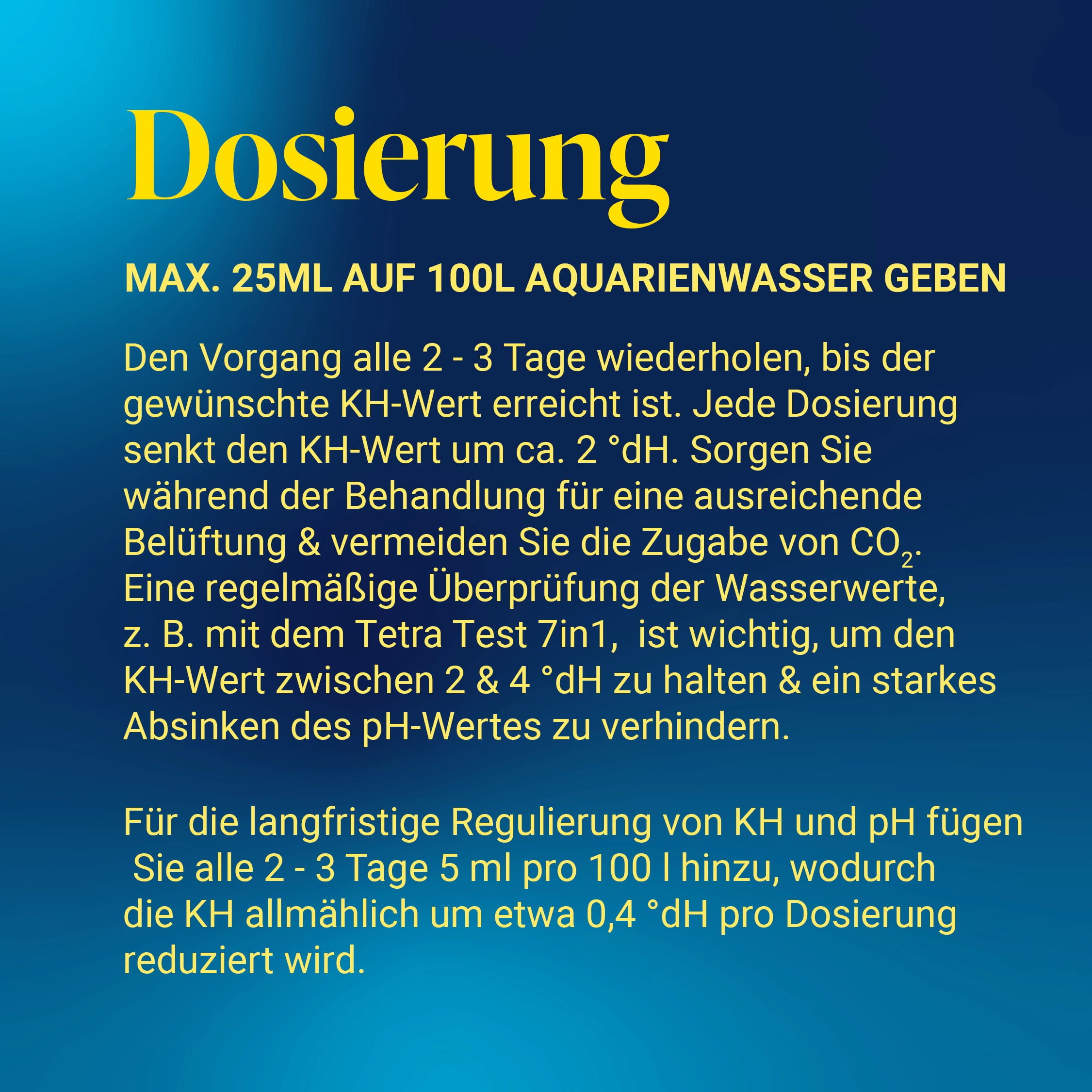 - Zur gezielten Senkung der Karbonathärte gibst du bis zu 25 ml Tetra pH/KH Minus auf 100 Liter Aquarienwasser. Dieser Vorgang reduziert die KH um etwa 2 °dH und kann alle 2 bis 3 Tage wiederholt werden, bis dein Zielwert erreicht ist.