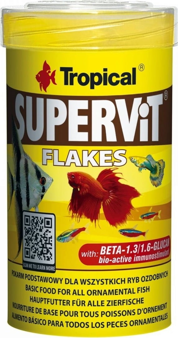 Supervit Flakes ist ein zutatenreiches Alleinfutter von Spitzenqualität in Flockenform zur täglichen Fütterung aller Aquariumfische. Es besteht aus Inhaltsstoffen, die den unterschiedlichen Ernährungsbedürfnissen im Gesellschaftsaquarium gehaltener Fische entsprechen. Das Futter enthält das natürliche Immunstimulans Beta-1,3/1,6-Glucan und stabilisiertes Vitamin C, welches das Immunsystem der Fische unterstützen kann.